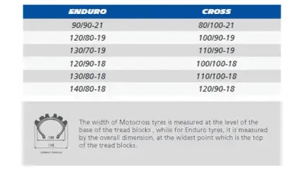 Enduro, Desert, S12XC 및 M12XC 모델의 경우 트레드 수준에서 측정된 타이어의 너비를 기준으로 사이즈 명칭이 지정되었습니다.